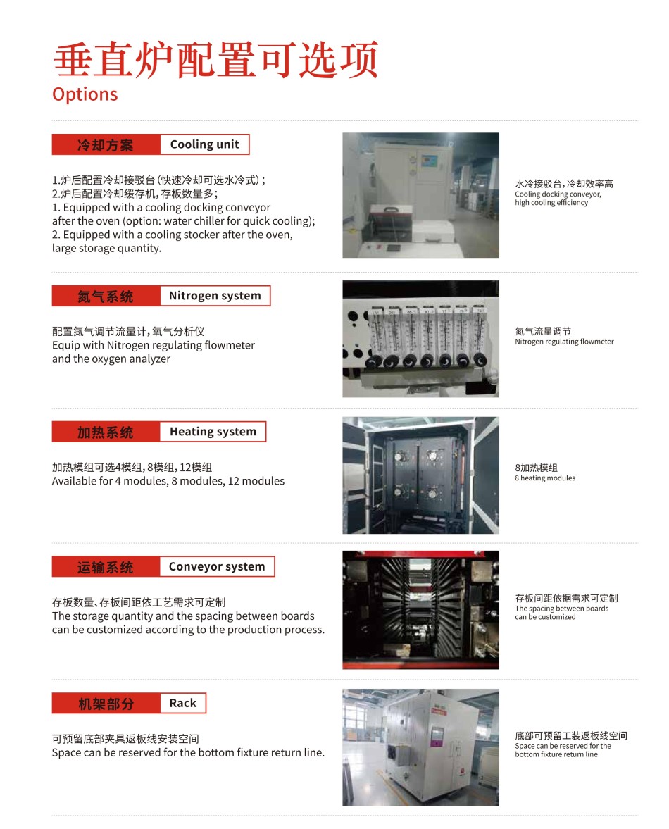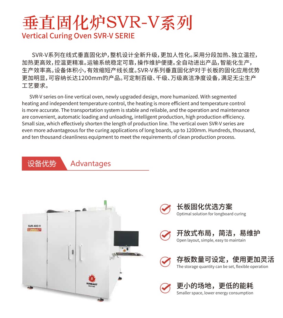 SVR-V系列在線式垂直固化爐,整機(jī)設(shè)計(jì)全新升級(jí),更加人性化。采用分段加熱、獨(dú)立溫控,加熱更高效,控溫更精準(zhǔn)。運(yùn)輸系統(tǒng)穩(wěn)定可靠,操作維護(hù)便捷。全自動(dòng)進(jìn)出產(chǎn)品,智能化生產(chǎn),生產(chǎn)效率高。設(shè)備體積小,有效縮短產(chǎn)線長(zhǎng)度。SVR-V系列垂直固化爐對(duì)于長(zhǎng)板的固化應(yīng)用優(yōu)勢(shì)更加明顯,可容納長(zhǎng)達(dá)1200mm的產(chǎn)品。可定制百級(jí)、千級(jí)、萬(wàn)級(jí)高潔凈度設(shè)備,滿足無(wú)塵生產(chǎn)工藝要求。