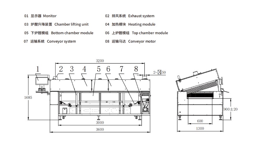 1.可選:機(jī)頭機(jī)尾可凸出,凸出上爐膛外側(cè)面尺寸300mm(整機(jī)尺寸會加長600mm)。 2.注明:根據(jù)產(chǎn)能要求,推薦溫區(qū)數(shù)量優(yōu)先選擇:4溫區(qū)、5溫區(qū)、 8溫區(qū)、9溫區(qū)、10溫區(qū)、12溫區(qū),可定制。 |