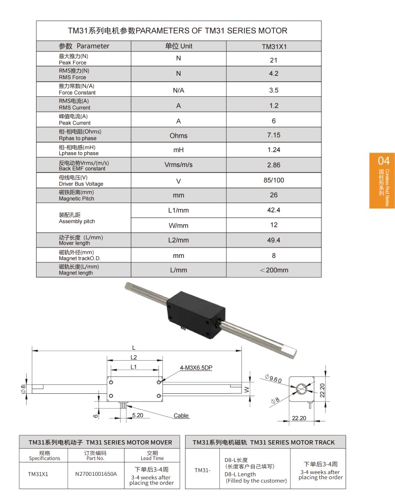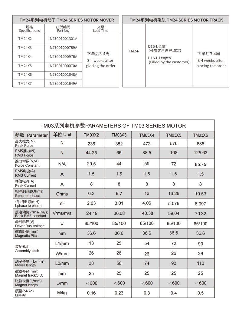 | TM 24系列圓柱形直線電機參數PARAMETERS OF TM 24 SERIES MOTOR | |||||||