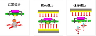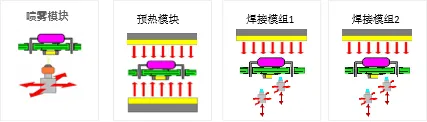 預(yù)熱模塊由底部預(yù)熱、頂部預(yù)熱、焊接保溫模塊組成。各溫區(qū)獨立循環(huán)、獨立控溫??筛鶕?jù)產(chǎn)品尺寸,自動關(guān)閉產(chǎn)品尺寸范圍外的加熱,節(jié)能簡單。
