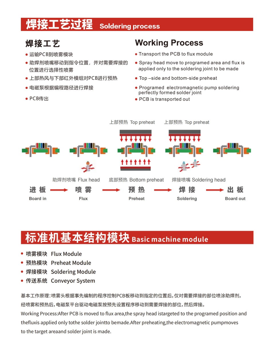 基本工作原理:噴霧頭根據事先編制的程序控制PCB板移動到指定的位置后, 僅對需要焊接的部位噴涂助焊劑,經噴霧和預熱后,電磁泵平臺驅動電磁泵按預先設置程序移動到需要焊接的部位,然后焊接。